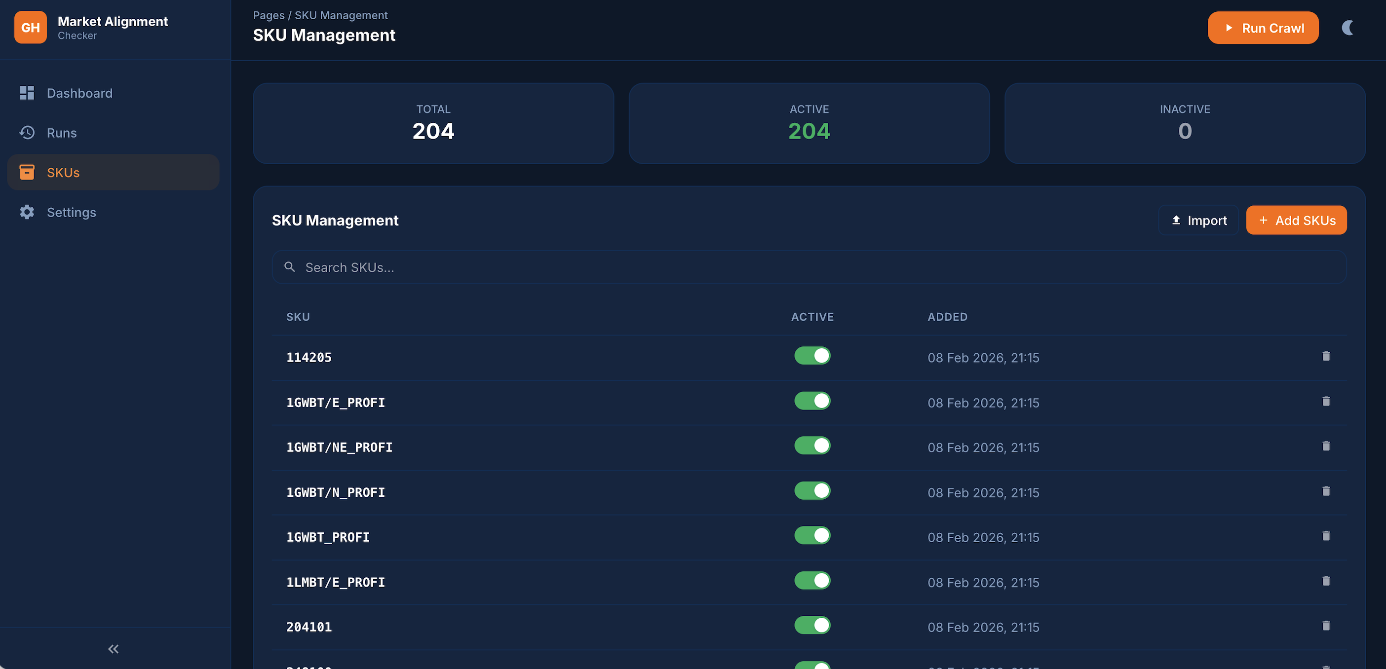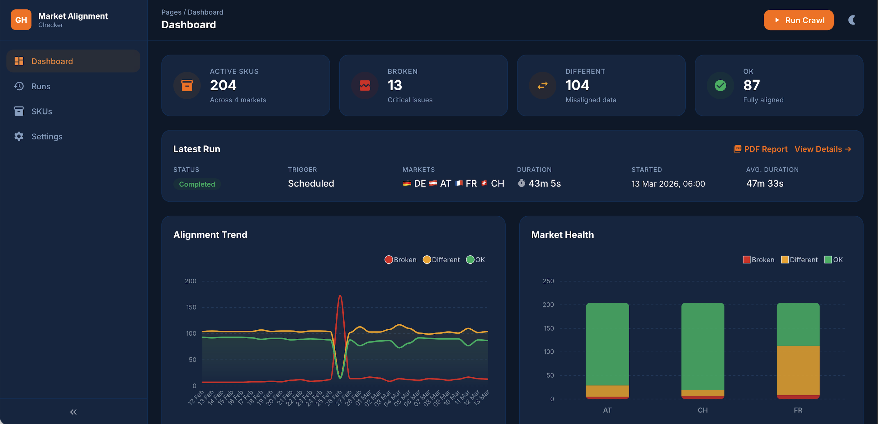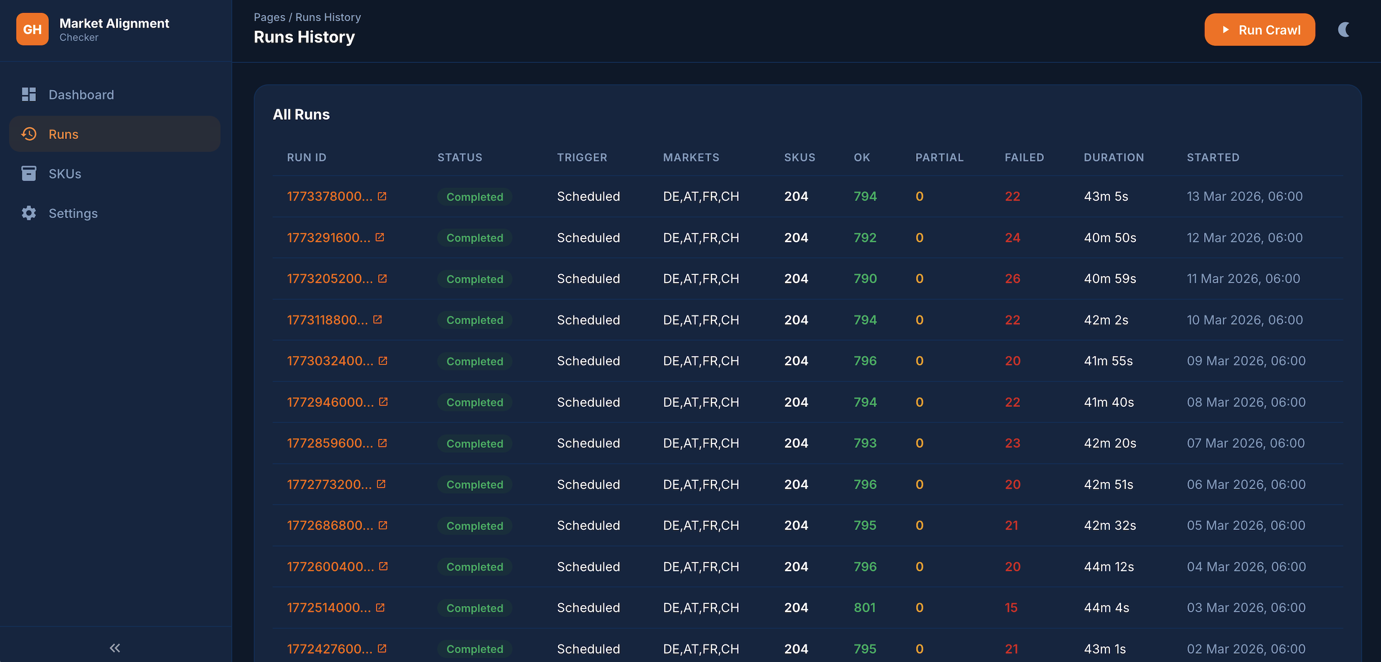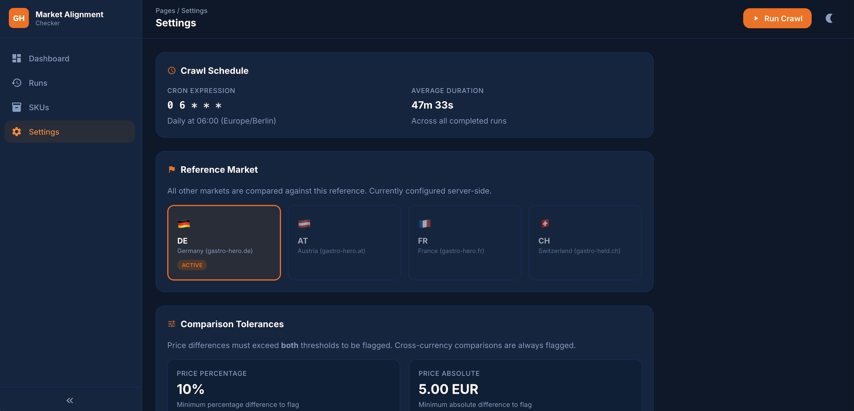 Designed and built a full-stack monitoring tool for GastroHero, a commercial kitchen equipment retailer operating across 4 European markets (DE, AT, CH, FR). The platform crawls each storefront daily using market-specific adapters for Magento, Shopify, Vue Storefront, Epoq, and Algolia, then compares pricing, availability, promotions, and delivery promises against the German reference market. Features a React dashboard with run history, filterable findings by severity and type, SKU management, and PDF/CSV report generation using Typst. The backend handles parallel browser-based crawling with configurable concurrency, automatic retries, and a cron scheduler. Sole developer on the project, from architecture and adapter reverse-engineering to deployment via Docker Compose with NGINX reverse proxy.